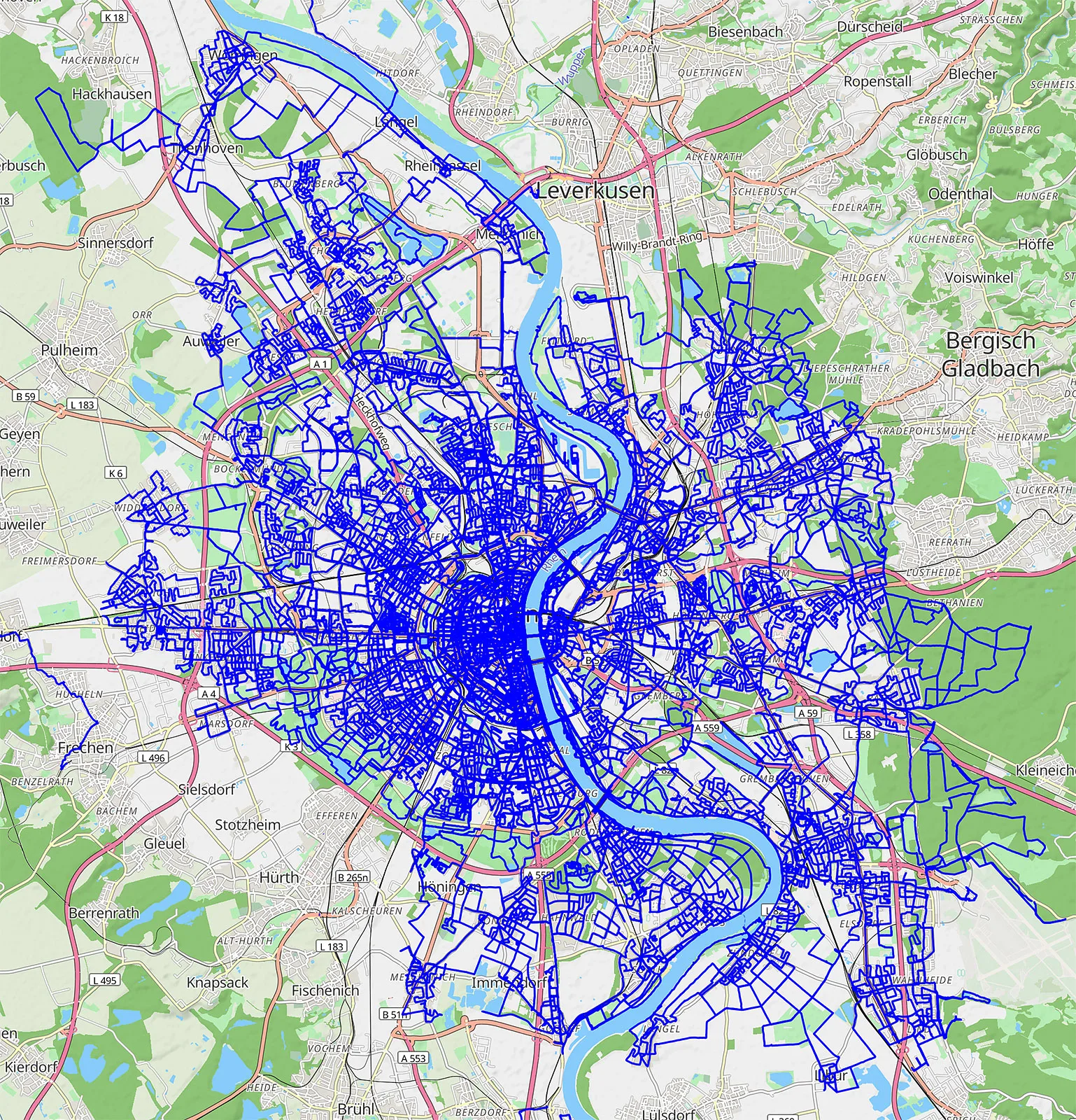 Meine gelaufenen, mit einer App aufgezeichneten Routen durch Köln. Mittlerweile sind es fast 5000 km zu Fuß zurückgelegte Kilometer. / My routes walked through Cologne, recorded with an app. By now, it's 5000 km of distance covered on foot.