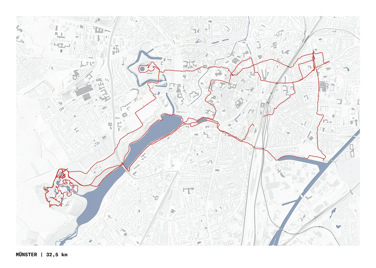 Meine gelaufenen, mit einer App aufgezeichneten Routen durch diverse Städte. / My walked routes through various cities, recorded with an app.